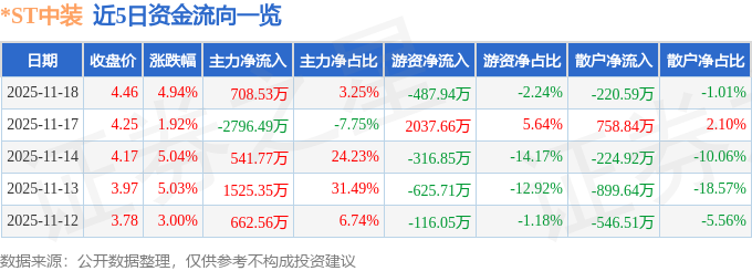 11月18日的资金流向数据方面,主力资金净流入708.53万元,占总成交额3.25%,游资资金净流出487.94万元,占总成交额2.24%,散户资金净流出220.59万元,占总成交额1.01%。