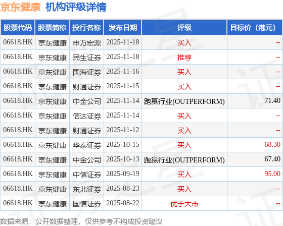 投行对该股的评级以买入为主,近90天内共有8家投行给出买入评级,近90天的目标均价为75.53港元。申万宏源最新一份研报给予京东健康买入评级。