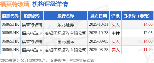 截至2025年11月19日收盘,福莱特玻璃(06865.HK)报收于11.76港元,下跌1.26%,成交量294.2万股,成交额3444.3万港元。投行对该股的评级以买入为主,近90天内共有3家投行给出买入评级,近90天的目标均价为13.09港元。东北证券最新一份研报给予福莱特玻璃买入评级,目标价14.6港元。