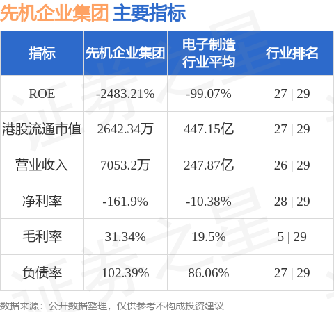 先机企业集团港股市值2642.34万港元,在电子制造行业中排名第27。主要指标见下表: