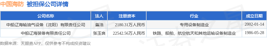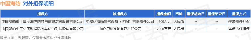 中国海防11月18日披露2笔对外担保,被担保公司2家。对外担保明细如下表: