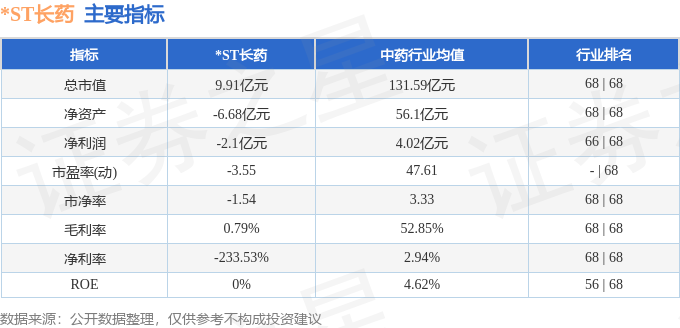 *ST长药主要指标及行业内排名如下: