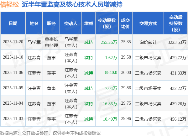 倍轻松近半年内的董监高及核心技术人员增减持详情如下: