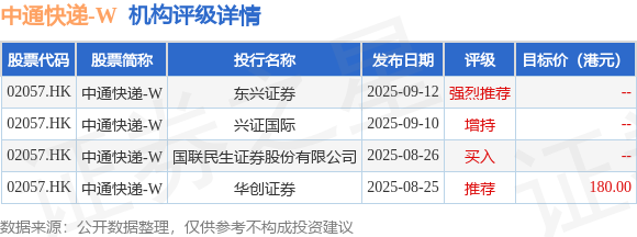 投行对该股的评级以增持为主,近90天内共有2家投行给出增持评级,近90天的目标均价为187.3港元。国泰海通证券股份有限公司最新一份研报给予中通快递-W增持评级,目标价195.99港元。