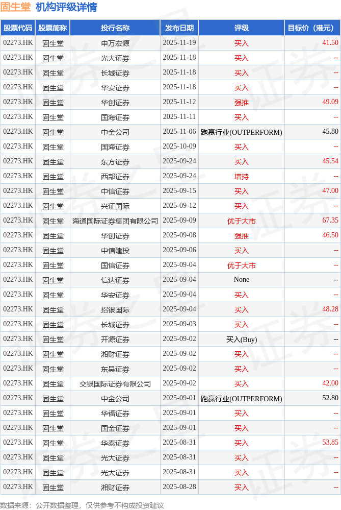 截至2025年11月21日收盘,固生堂(02273.HK)报收于28.86港元,下跌1.7%,成交量196.88万股,成交额5666.06万港元。投行对该股的评级以买入为主,近90天内共有22家投行给出买入评级,近90天的目标均价为49.06港元。申万宏源最新一份研报给予固生堂买入评级,目标价41.5港元。