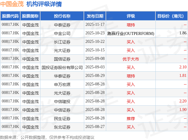 截至2025年11月21日收盘,中国金茂(00817.HK)报收于1.46港元,下跌0.68%,成交量3679.08万股,成交额5403.37万港元。投行对该股的评级以买入为主,近90天内共有8家投行给出买入评级,近90天的目标均价为1.97港元。中泰证券最新一份研报给予中国金茂增持评级。