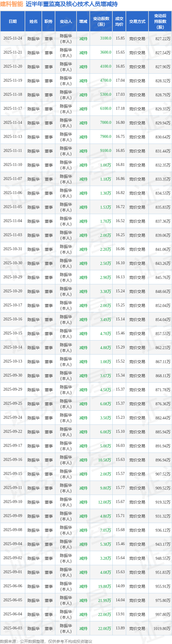 建科智能近半年内的董监高及核心技术人员增减持详情如下: