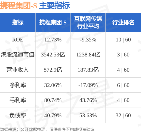 携程集团-S港股市值3542.53亿港元,在互联网传媒行业中排名第3。主要指标见下表: