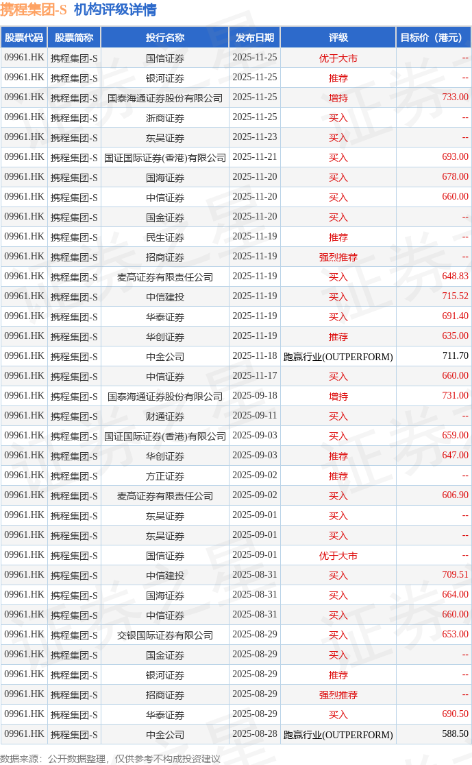 投行对该股的评级以买入为主,近90天内共有21家投行给出买入评级,近90天的目标均价为671.79港元。国信证券最新一份研报给予携程集团-S优于大市评级。