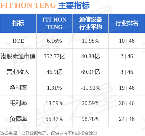 FIT HON TENG港股市值352.77亿港元,在通信设备行业中排名第2。主要指标见下表: