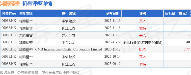 投行对该股的评级以买入为主,近90天内共有3家投行给出买入评级,近90天的目标均价为6.58港元。中信建投最新一份研报给予鸿腾精密买入评级。