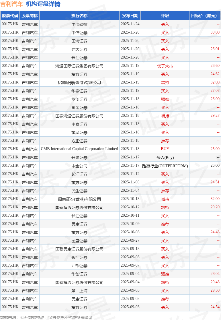 投行对该股的评级以买入为主,近90天内共有20家投行给出买入评级,近90天的目标均价为27.35港元。中信建投最新一份研报给予吉利汽车买入评级。