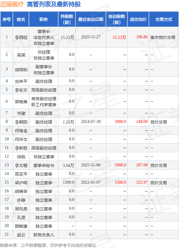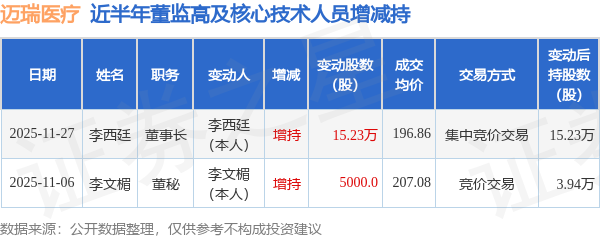 证券之星消息,根据11月27日市场公开信息、上市公司公告及交易所披露数据整理,迈瑞医疗(300760)最新董监高及相关人员股份变动情况:2025年11月27日公司董事长李西廷共增持公司股份15.23万股,占公司总股本为0.0126%。变动期间公司股价上涨1.5%,11月27日当日收盘报196.3元。