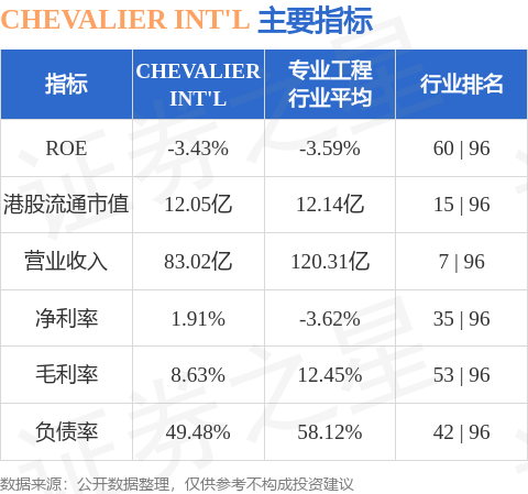 CHEVALIER INT'L港股市值12.05亿港元,在专业工程行业中排名第15。主要指标见下表:
