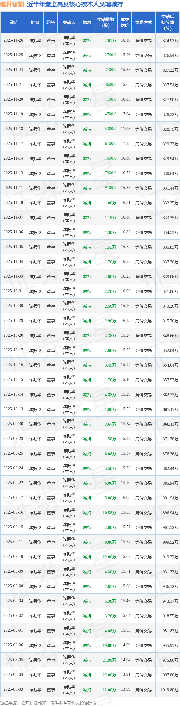 建科智能近半年内的董监高及核心技术人员增减持详情如下: