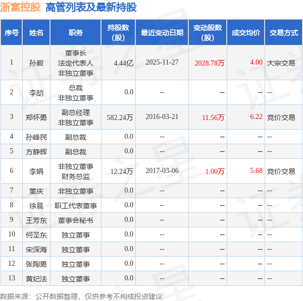 证券之星消息,根据11月27日市场公开信息、上市公司公告及交易所披露数据整理,浙富控股(002266)最新董监高及相关人员股份变动情况:2025年11月27日公司董事长,董事孙毅共增持公司股份2028.78万股,占公司总股本为0.3887%。变动期间公司股价下跌0.5%,11月27日当日收盘报4.0元。