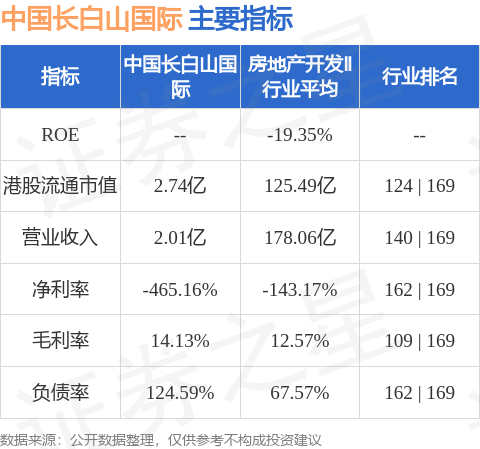 中国长白山国际港股市值2.74亿港元,在房地产开发Ⅱ行业中排名第124。主要指标见下表: