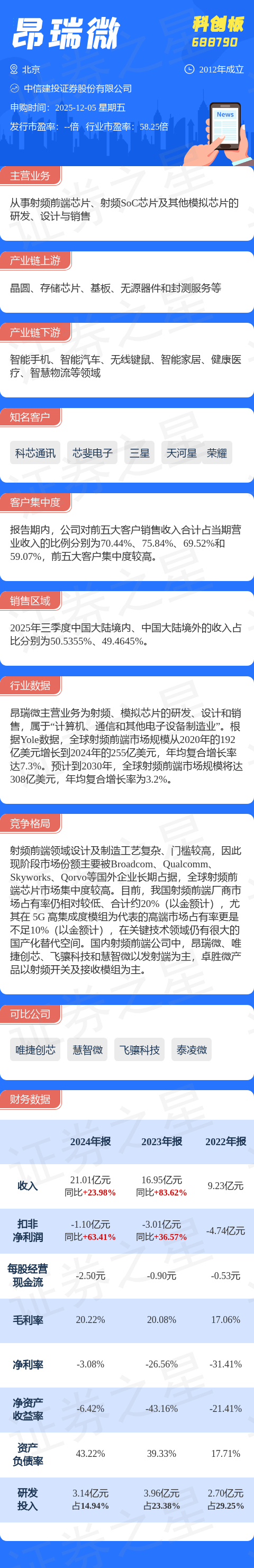 证券之星消息,昂瑞微12月5日网上申购,申购代码为787790,中签号公布日期为12月9日。该股概况请见下图:
