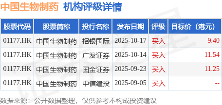截至2025年12月4日收盘,中国生物制药(01177.HK)报收于6.88港元,上涨1.93%,成交量3581.99万股,成交额2.44亿港元。投行对该股的评级以买入为主,近90天内共有4家投行给出买入评级,近90天的目标均价为10.73港元。招银国际最新一份研报给予中国生物制药买入评级,目标价9.4港元。