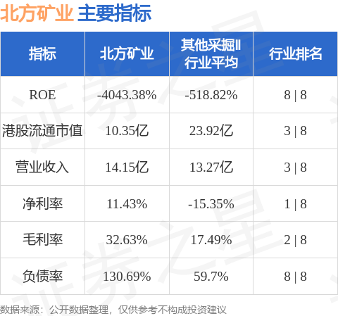 北方矿业港股市值10.35亿港元,在其他采掘Ⅱ行业中排名第3。主要指标见下表: