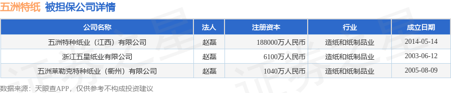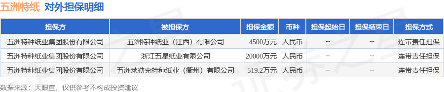 五洲特纸12月3日披露3笔对外担保,被担保公司3家。对外担保明细如下表: