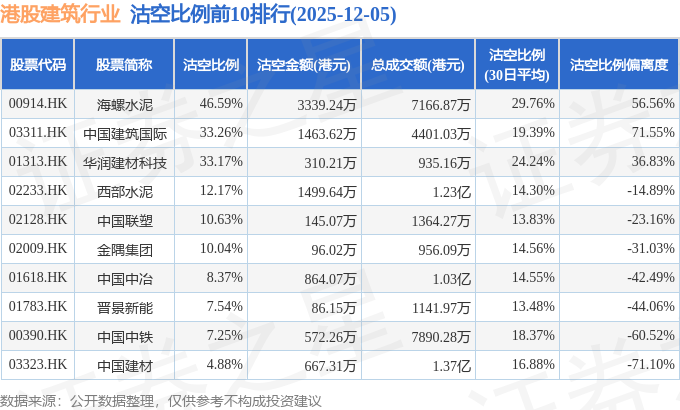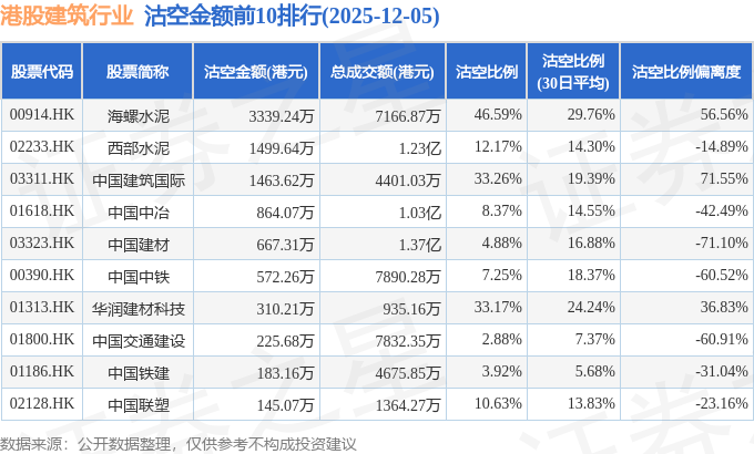 从沽空比例来看,海螺水泥、中国建筑国际、华润建材科技沽空比例位居行业前三,分别为46.59%、33.26%、33.17%。
