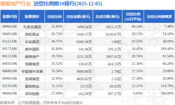 从沽空比例偏离度来看,深圳控股、鹰君、嘉华国际沽空比例偏离度位居行业前三,分别为304%、190.09%、189.46%。