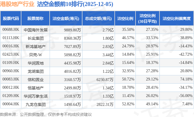 从沽空金额来看,中国海外发展、长实集团、新鸿基地产沽空金额位居行业前三,分别为9889.8万港元、8360.36万港元、7027.89万港元。