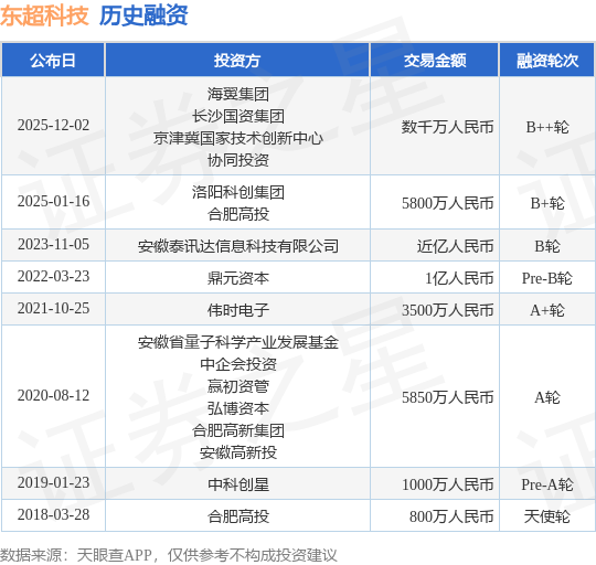 证券之星消息,根据天眼查APP于12月2日公布的信息整理,安徽省东超科技有限公司B++轮融资,融资额数千万人民币,参与投资的机构包括海翼集团,长沙国资集团,京津冀国家技术创新中心,协同投资。
