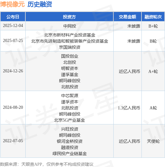 证券之星消息,根据天眼查APP于12月4日公布的信息整理,北京博视像元科技有限公司B+轮融资,融资额未披露,参与投资的机构包括中网投。