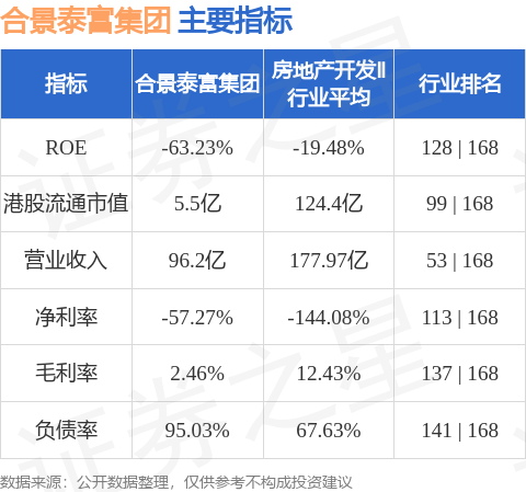 合景泰富集团港股市值5.5亿港元,在房地产开发Ⅱ行业中排名第99。主要指标见下表: