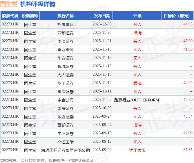 截至2025年12月8日收盘,固生堂(02273.HK)报收于28.46港元,与上一交易日持平,成交量146.46万股,成交额4117.39万港元。投行对该股的评级以买入为主,近90天内共有11家投行给出买入评级,近90天的目标均价为48.53港元。招银国际最新一份研报给予固生堂买入评级,目标价44.95港元。