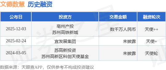 证券之星消息,根据天眼查APP于12月3日公布的信息整理,文德数慧(苏州)科技有限公司天使++融资,融资额数千万人民币,参与投资的机构包括亳州产投,苏州高铁新城。