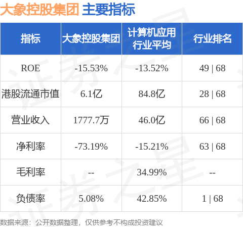大象控股集团港股市值6.1亿港元,在计算机应用行业中排名第28。主要指标见下表: