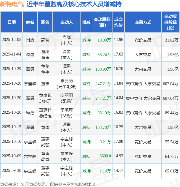 新特电气近半年内的董监高及核心技术人员增减持详情如下: