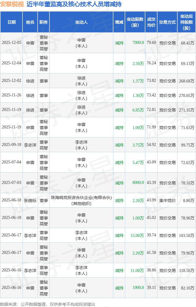 安联锐视近半年内的董监高及核心技术人员增减持详情如下: