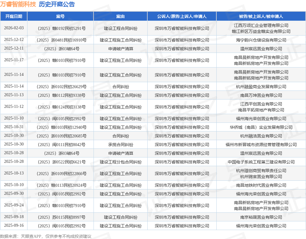 案号:(2025)浙03破64号根据统计,近一年内以深圳市万睿智能科技有限公司为当事人的历史开庭公告有72则,其中案由为“建设工程施工合同纠纷”的公告以44则居首,其次为“建设工程合同纠纷”有7则,“买卖合同纠纷”有6则。历史开庭公告(前20条)如下: