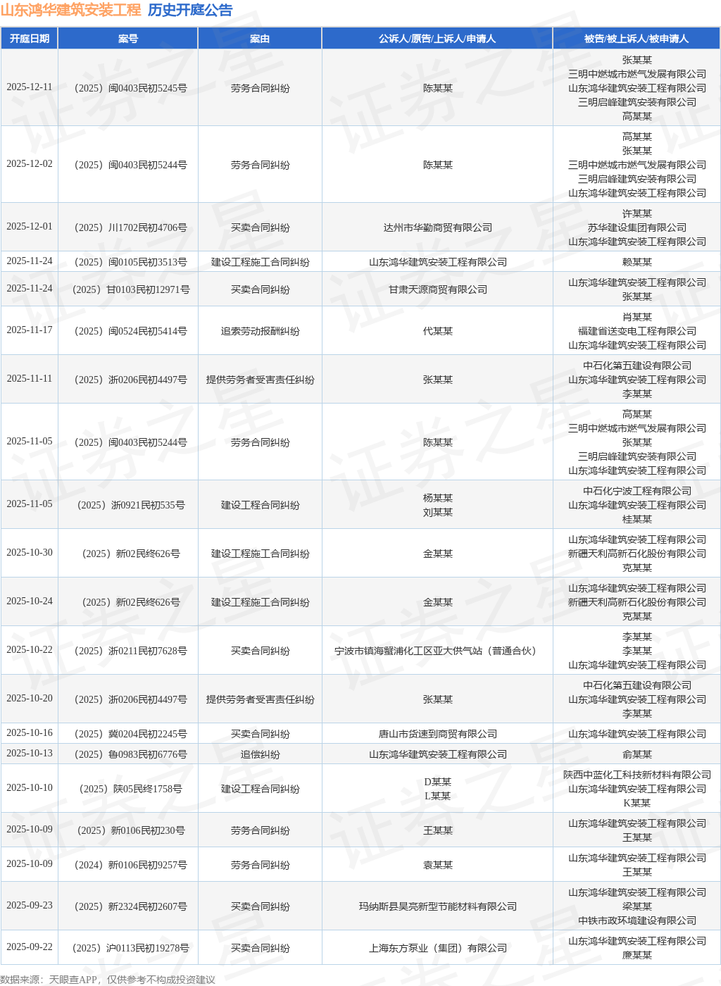 案号:(2025)闽0403民初5245号根据统计,近一年内以山东鸿华建筑安装工程有限公司为当事人的历史开庭公告有120则,其中案由为“建设工程施工合同纠纷”的公告以19则居首,其次为“买卖合同纠纷”有18则,“劳务合同纠纷”有16则。历史开庭公告(前20条)如下:
