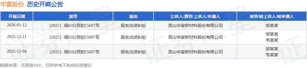 证券之星消息,根据天眼查APP显示,近日公布了一则昆山华富新材料股份有限公司作为原告/上诉人的开庭公告,详细内容如下:
