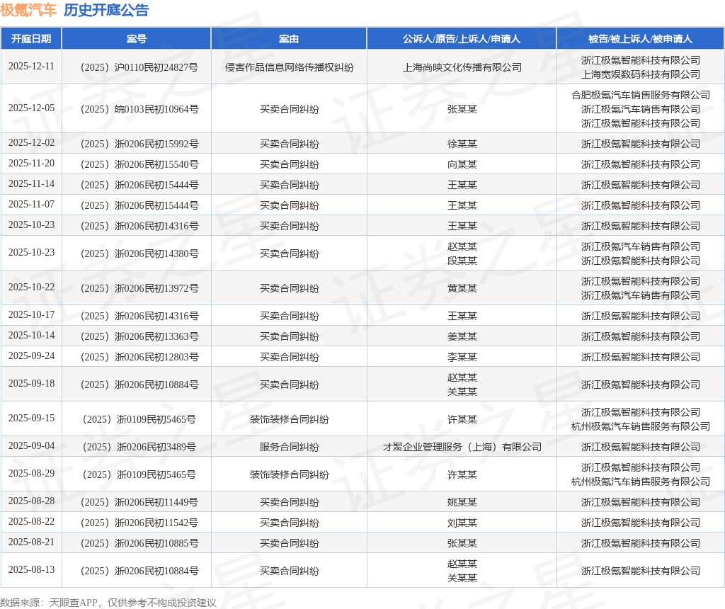 案号:(2025)沪0110民初24827号根据统计,近一年内以浙江极氪智能科技有限公司为当事人的历史开庭公告有52则,其中案由为“买卖合同纠纷”的公告以32则居首,其次为“装饰装修合同纠纷”有8则,“服务合同纠纷”有3则。历史开庭公告(前20条)如下: