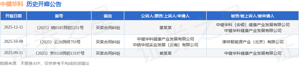 案号:(2025)皖0181民初5251号根据统计,近一年内以中健华科健康产业发展有限公司为当事人的历史开庭公告有3则,其中案由为“买卖合同纠纷”的公告以3则居首。历史开庭公告如下: