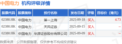 截至2025年12月8日收盘,中国电力(02380.HK)报收于3.44港元,下跌1.15%,成交量631.89万股,成交额2175.19万港元。投行对该股的评级以买入为主,近90天内共有3家投行给出买入评级,近90天的目标均价为4.73港元。第一上海最新一份研报给予中国电力买入评级,目标价4.73港元。