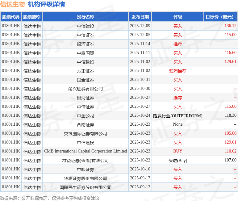 投行对该股的评级以买入为主,近90天内共有12家投行给出买入评级,近90天的目标均价为118.29港元。中信建投最新一份研报给予信达生物买入评级,目标价136.12港元。