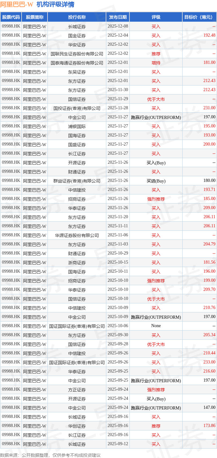 投行对该股的评级以买入为主,近90天内共有30家投行给出买入评级,近90天的目标均价为199.18港元。长城证券最新一份研报给予阿里巴巴-W买入评级。