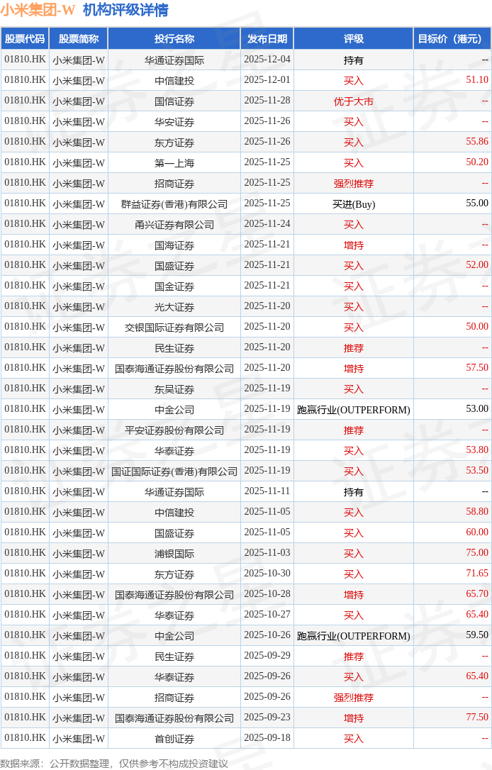 截至2025年12月10日收盘,小米集团-W(01810.HK)报收于41.78港元,上涨1.26%,成交量1.13亿股,成交额46.9亿港元。投行对该股的评级以买入为主,近90天内共有19家投行给出买入评级,近90天的目标均价为59.52港元。华通证券国际最新一份研报给予小米集团-W持有评级。