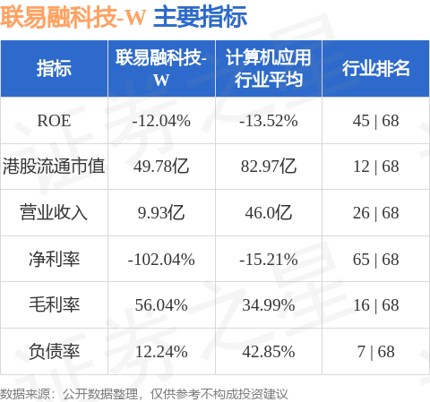 联易融科技-W港股市值49.78亿港元,在计算机应用行业中排名第12。主要指标见下表: