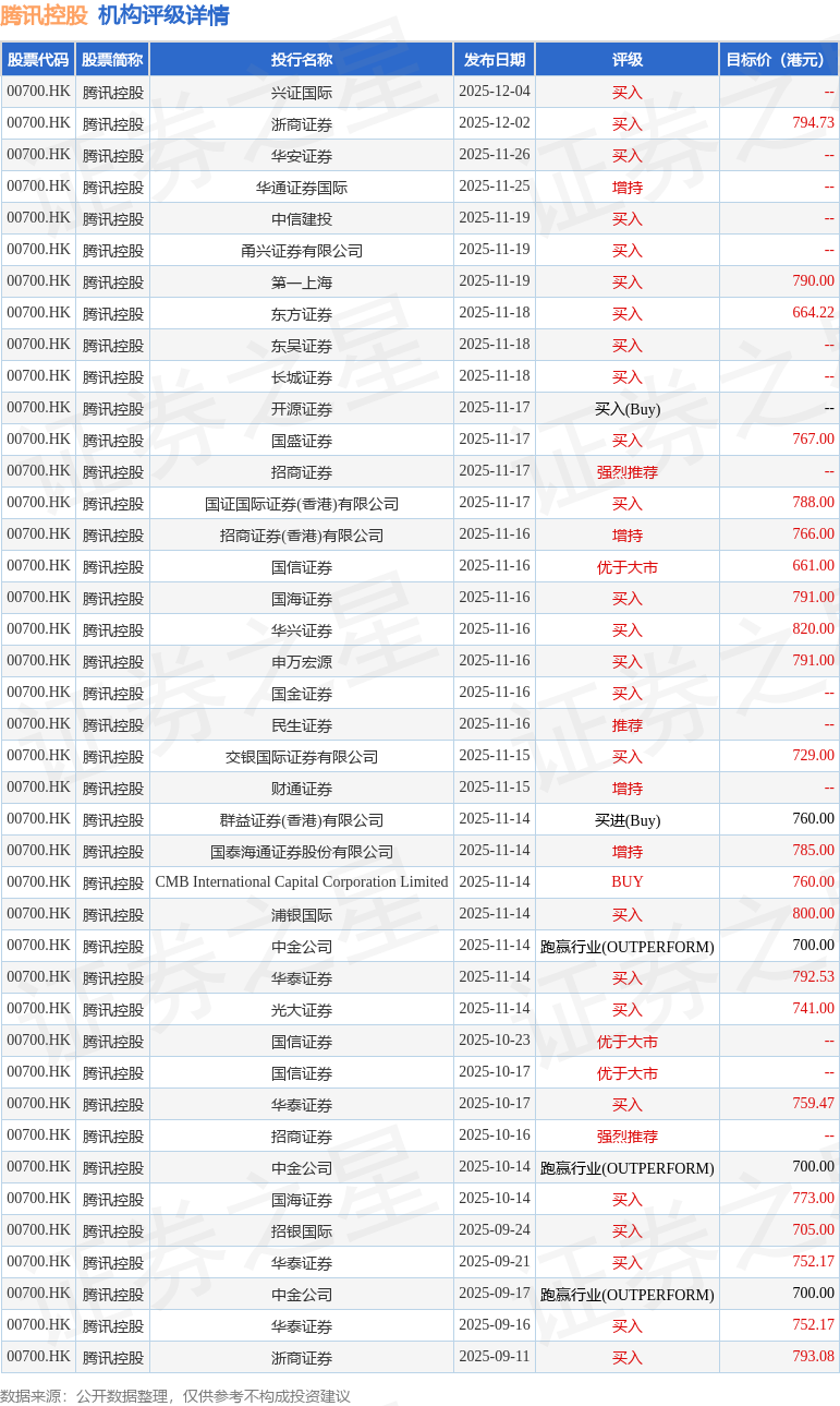 截至2025年12月10日收盘,腾讯控股(00700.HK)报收于603.0港元,上涨0.08%,成交量1475.07万股,成交额88.43亿港元。投行对该股的评级以买入为主,近90天内共有25家投行给出买入评级,近90天的目标均价为755.21港元。兴证国际最新一份研报给予腾讯控股买入评级。