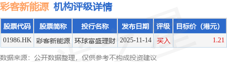 截至2025年12月10日收盘,彩客新能源(01986.HK)报收于0.8港元,与上一交易日持平,成交量41.55万股,成交额32.34万港元。投行对该股的评级以买入为主,近90天内共有1家投行给出买入评级,近90天的目标均价为1.21港元。环球富盛理财最新一份研报给予彩客新能源买入评级,目标价1.21港元。