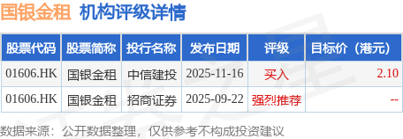 截至2025年12月10日收盘,国银金租(01606.HK)报收于1.66港元,与上一交易日持平,成交量98.0万股,成交额163.08万港元。投行对该股的评级以强烈推荐为主,近90天内共有1家投行给出强烈推荐评级,近90天的目标均价为2.1港元。中信建投最新一份研报给予国银金租买入评级,目标价2.1港元。
