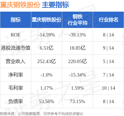 重庆钢铁股份港股市值6.51亿港元,在钢铁行业中排名第9。主要指标见下表: